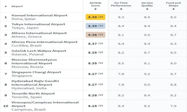 Globally, the three best airports are Hamad International Airport (8.39) in Qatar, Tokyo International Airport (8.39) in Japan and Athens International Airport (8.38) in Greece.