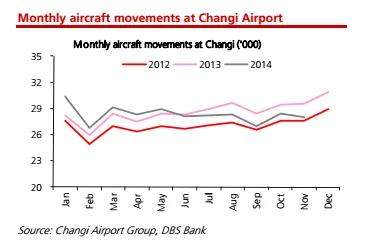 After multiple years of double-digit growth in passenger traffic and aircraft movement at Changi Airport over 2010-12, growth rate moderated to around 5% in 2013. In 2014, aircraft movements have shown y-o-y declines over the last six months.