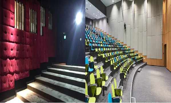 “The pre-existing cinema screening halls have been converted to lecture theatres catering to different audience size and requirements,” the firm explained. “Retaining the acoustic properties of the screening halls, the interior finishes, chairs and AV provisions have been replaced to meet the needs of a lecture theatre.”
