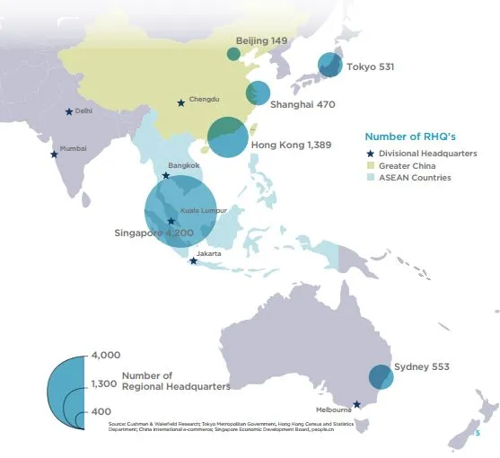 The map above shows where most number of MNCs have put up their regional headquarters.