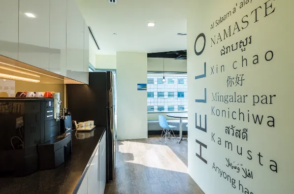 Meanwhile, to be in sync with the Partners’ intent to encourage their staff to have fun whilst working, POD I+A designed a graphic mural wall, prominently sited, where one is greeted at the pantry entrance with a BIG HELLO. It was written out in multiple Asian languages to showcase Infosys Consulting’s global reach.