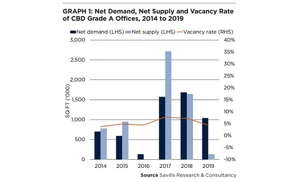 The report noted that the latter injected about 214,000 sqft of new supply into the Grade A office market in Q4. For the whole of 2019, the net take-up of CBD Grade A offices amounted to 1.04 million sqft.