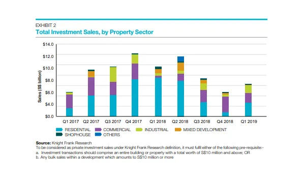 Despite the slowdown in en bloc market, total investment sales went up by nearly 34% to $6.3b in Q1 2019 from $4.7b in Q4 2018, according to a report by Knight Frank.