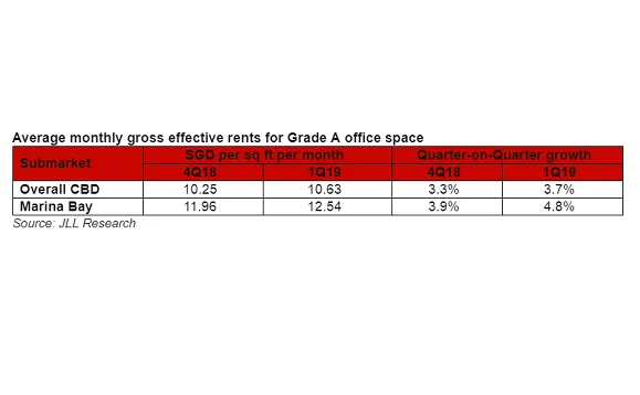 “Q1 2019 rent growth was broad-based across all submarkets, with Marina Bay in the lead. As of the end of Q1 2019, the average monthly gross effective rent of Grade A office space in the Marina Bay submarket stood at $12.54 psf after rising 4.8% QoQ from $11.96 psf in Q4 2018,” JLL noted.