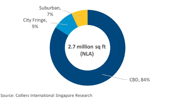 This chart from Colliers International shows that a significant majority of the Singapore market's total flexible workspace footprint (84%) is within the Central Business District (CBD).