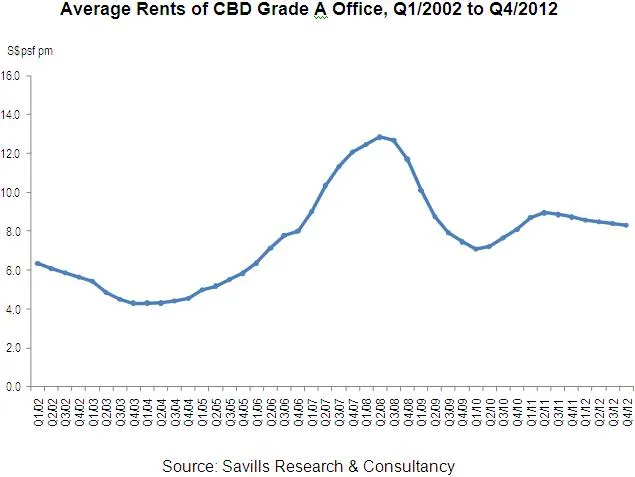 Consequently, the monthly rents of overall Grade A offices averaged at S$8.31 per sq ft in Q4/2012, falling by about 5.0% from S$8.72 per sq ft a year ago.