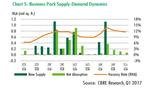 The business park market ended the first quarter of the year with a stable performance as overall vacancy rate continued trending downwards in Q1.