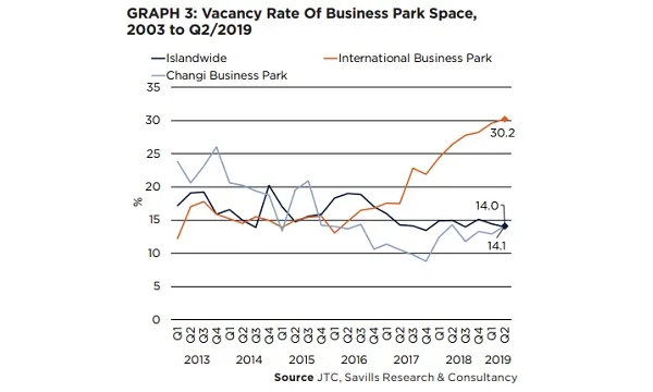 International Business Park reported a record-high vacancy rate of 30.2% in Q2 , whilst the vacancy rate of Changi Business Park jumped 1.2 ppt QoQ to 14.1% over the same period.