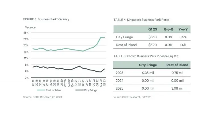 This chart from CBRE showed that vacancy rates in business parks increased in the city fringe to 5.3% to 3.5% in the fourth quarter of 2022.