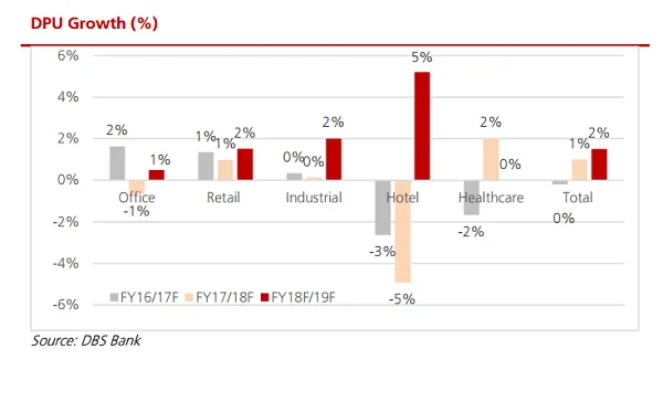 This will be led by the hospitality sector, as it is expected to rise 5% in FY18/FY19 after DPU slumped 5% and 3% in the past cycles.