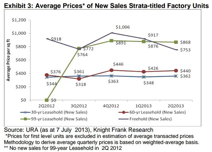 Knight Frank said that as such, the price gaps between the various tenures, such as between the 30-year and 60-year leasehold strata-titled factory units in both the primary and secondary markets have been narrowing.