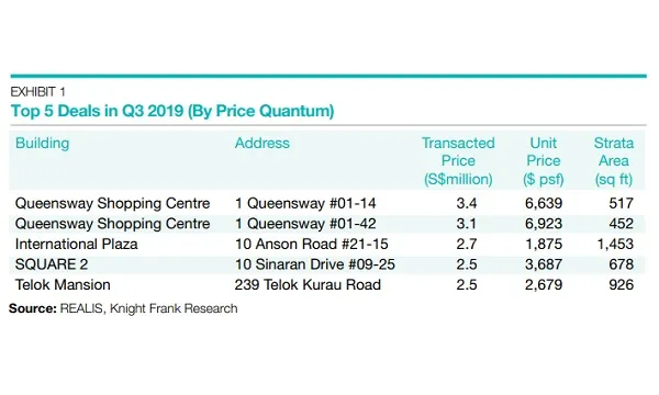 This chart from Knight Frank reveals the top 5 strata-titled retail deals in Q3, led by two separate transactions in Queensway Shopping Centre with a combined total of $6.5m.