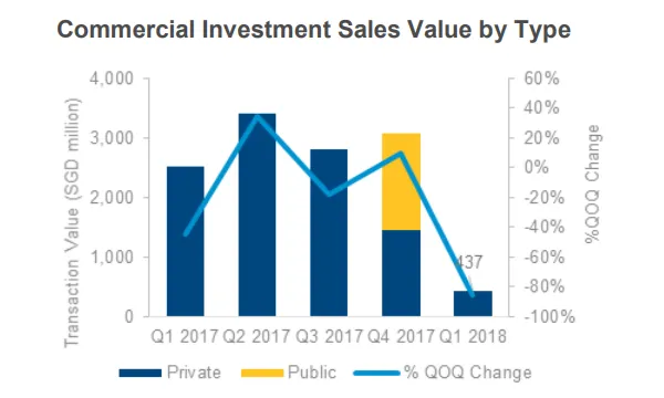 This chart from Colliers International shows that in the first quarter of 2018, total commercial investment sales declined 86% to $437.4m (US$334m) compared to the last quarter.