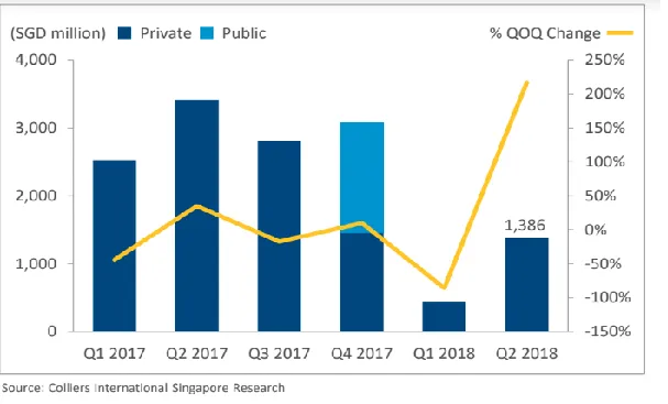 This chart from Colliers International Singapore Research showed that the commercial sector turned around in Q2 with investment sales rising to 216.8% to $1.4b from a slump in Q1.