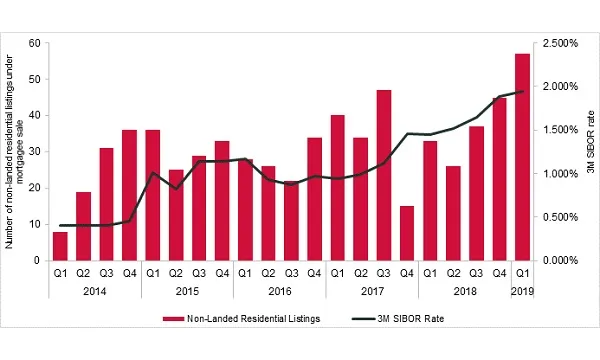 This chart from Knight Frank shows the number of private condominium listings under mortgagee sales as well as the 3M SIBOR rate for the past five years. There were 57 non-landed residential listings in Q1 2019, up by 26.7% QoQ. The 3M SIBOR rate also rose progressively from 1.448% in Q1 2018 to 1.944%.