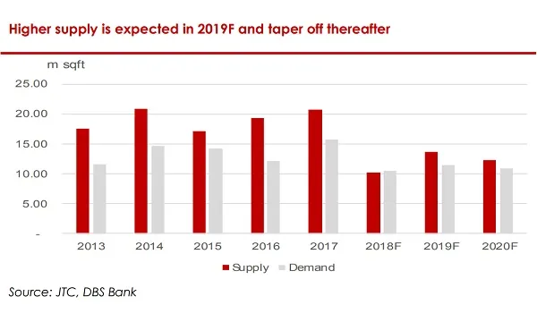The supply surge in 2019 could be the result of a delay in completions in 2018. However, DBS noted that it is also expected to reduce over the next few years. Downward pressures to rentals and occupancy rates could be controlled over the coming years.
