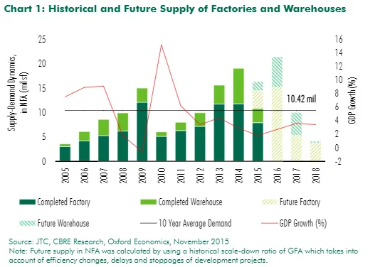 Supply has surpassed demand since 2013, CBRE noted, while a strong supply of industrial space is expected to come on stream in 2015 and 2016.