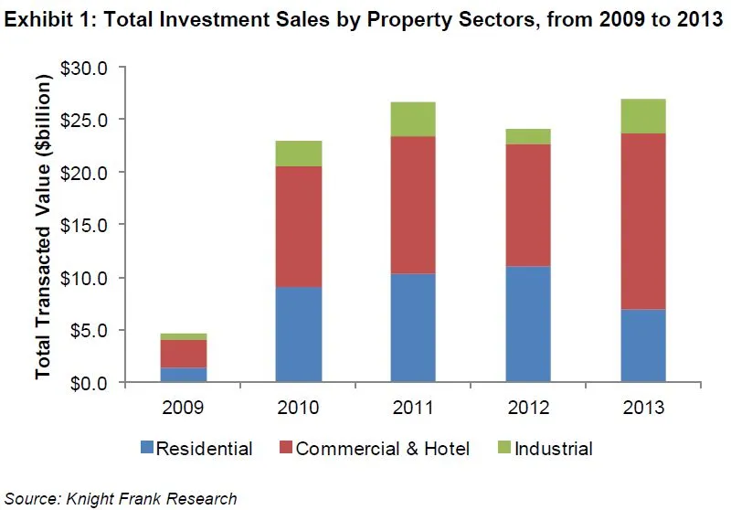 According to Knight Frank, overall, the investment sales market performed better in 2013. It chalked up an accumulated sum of $27.0 billion, which represented a 11.9 per cent year-on-year (y-o-y) increase.
