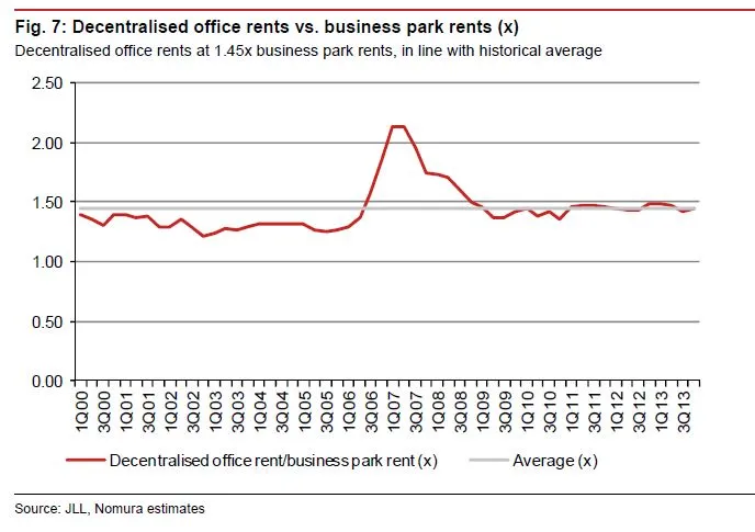 "In addition, we note the increase in business park rents has mostly kept pace with the rise in decentralised office rents (decentralised office rents 1.45x business park rents as of end-4Q13, in line with the average multiple since 2000)," Nomura said.