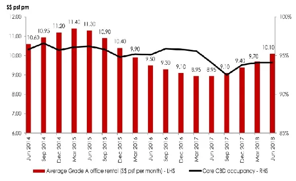 This chart from OCBC Investment Research (OIR) with data from CBRE Research shows that Grade A core central business district (CBD) office rents sustained its growth momentum with rates rising 4.1% QoQ to $10.10 psf/month in Q2.