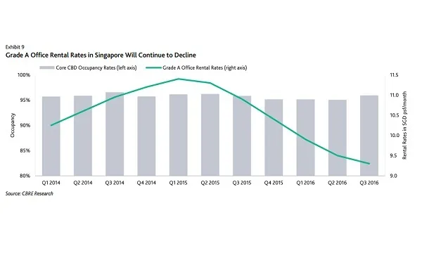 Based on the graph, Grade A office rents has been on the downturn since 1Q15, with a slump below $9.5psf/month reflected in 3Q16.