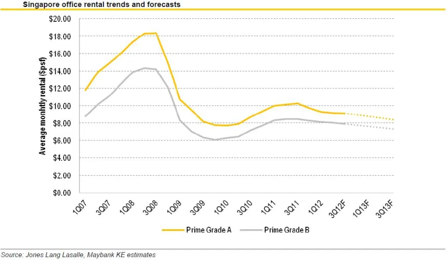 We were spot-on for Grade A, where rents have already fallen by 9.4% to average at SGD9.20 psf pm in 2Q12. Grade B rents were however surprisingly resilient, correcting by a milder 5.3% YoY.