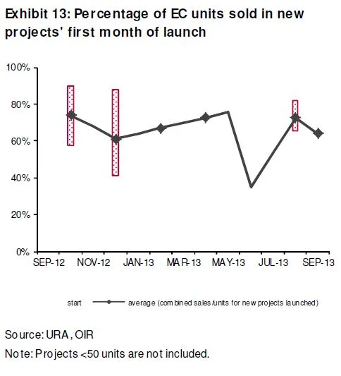 While take-up rates recovered in Sep-13 in the RCR segment due to attractive pricing strategies from developers, the OCR segment – the key drivers of market transactions thus far – appear to be still finding its feet after several large launches (The Glades at Bedok and Skywoods and Dairy Farm Rd) showed relatively lackluster results.