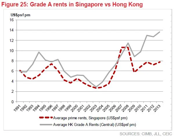 Chart of the Day: This graph shows Singapore Grade A rents are creeping away from Hong Kong's rate