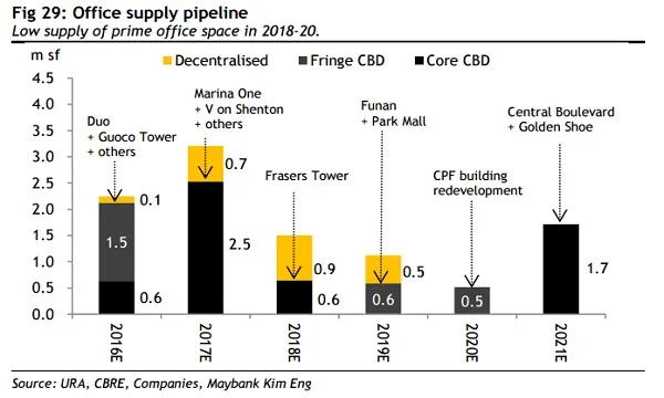 Maybank KimEng noted that Office REITs may hit a potential bottom in the early 2018, as supply thins out.