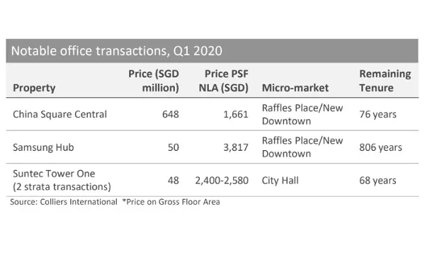 This chart from Colliers International reveals that China Square Central recorded the biggest transaction price amongst office investments in Q1 at $648m. It is followed by Samsung Hub priced $50m, and two strata sales in Suntec Tower One for $48m.