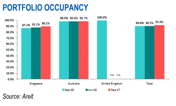 This chart from UOB Kay Hian (UOBKH) shows that the occupancy rate of the Singapore portfolio of Ascendas Real Estate Investment Trust (AREIT) dipped 3 ppt YoY to 87.1% in September.