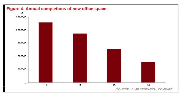 In 2014, there were numerous office transactions to third parties including, sale of Straits Trading Building to Sun Venture Group for S$450m (or cS$2,812psf) and divestment of Equity Plaza for S$550m (or $2,181psf) to a GSH-led consortium as well as sale of 92.8% of Prudential Tower for S$512m (S$2,316psf) to a consortium of 4 parties. In addition, Westgate was also on-sold by Capitaland to Sun Venture and another party jointly for a total of S$579m (S$1900psf) as well as the recent AXA Tower deal to a PREH-led consortium for S$1.17bn (S$1735psf).