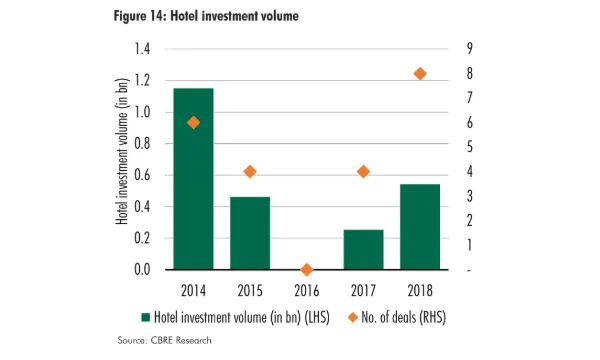 This chart from CBRE Research shows that hotel investments more than doubled to about eight deals for a total of about $500m in 2018 from just four deals worth $200m in 2017. The research firm noted that no deals were secured in 2016.