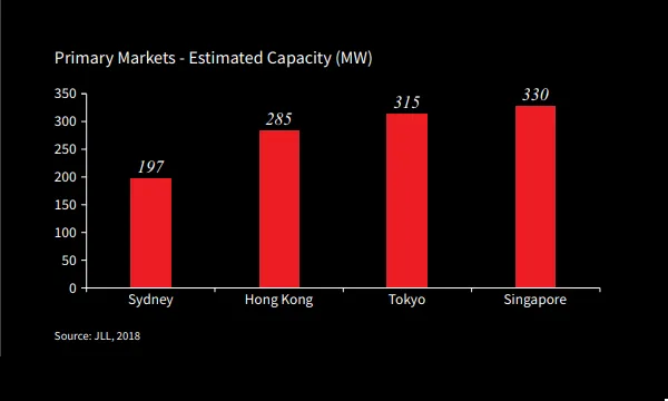 This chart from JLL shows that Singapore is Asia’s leading market for data centres with an estimated total capacity of 330 MW.