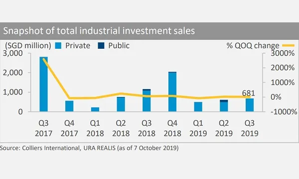 The nine-month tally remained modest at $1.8b. However, Colliers forecasts industrial sales to increase by 30% YoY for the full year of 2019, to be driven by big-ticket transactions by REITs and industrialists.