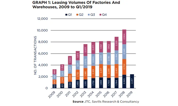 The industrial leasing market rose for the eleventh consecutive quarter in Q1, according to a report from Savills. There were a total of 2,417 deals sealed for factory and warehouse space, up 3.1% from the previous year.