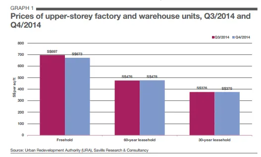 The Savills basket of upper-storey factory and warehouse units shows prices moderating on a quarterly basis in Q4/2014. Freehold units had the most significant price decline of 3.4% QoQ while 30-year leasehold units slipped by 0.4%. 60-year leasehold units rebounded from Q3/2014’s 1.0% decline, rising 0.6% in Q4/2014. Throughout 2014, price movements have been more volatile as compared to previous years, mainly due to lesser transactions which led to the lack of robust price information for both buyers and sellers.