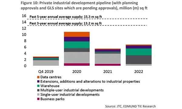 This chart from EDMUND TIE shows that there will be 26.2 million sqft NLA of private industrial development in the pipeline from Q4 2019 to 2022. This translates to an annual average of 8.1 million sqft, falling below the past 3-year average of 13.2 million sqft and past 5-year average of 15.3 million sqft.