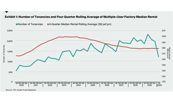 In addition, median rents of multiple-user factories have stayed flat in Q1. Factories with tenures 60 years and above, including 999-year leasehold and freehold assets, saw a marginal uptick of 2.1% QoQ in median prices in Q1 after consecutive declines in the previous two quarters.