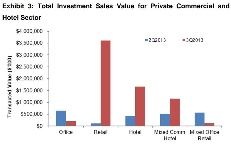 According to Knight Frank, total investment sales in the private commercial and hotel sector was robust at $6.8 billion in 3Q 2013 with a number of large retail and hotel investment transactions.