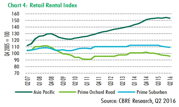According to a report by CBRE, average prime rents for Orchard Road and Suburban continued to tumble for the sixth and third quarter respectively in 2Q16.