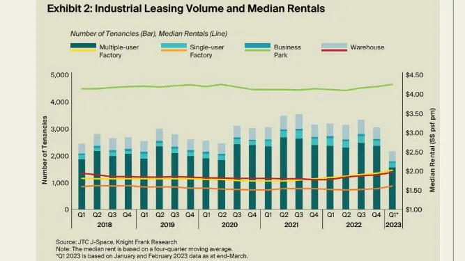 Knight Frank’s industrial property report showed the decline in islandwide leasing volume for multiple-user factories by 1.5% quarter-on-quarter to 1,548 tenancies in the first two months of 2023.