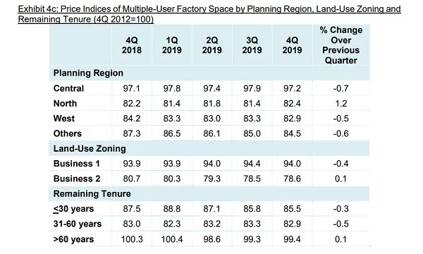 This chart from JTC Corporation revealed that the price of multiple-user factory space in the North region rose 1.2% QoQ in Q4 2019. Meanwhile, the prices in other regions declined between 0.5% to 0.7%.