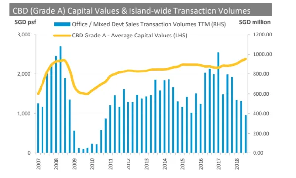 This chart from Colliers International shows that the volume of office and mixed-used commercial sales dropped 28% QoQ to $3.83b mainly due to the smaller average size of deals transacted during the quarter compared to Q3 2017 when Asia Square Tower 2 was sold.