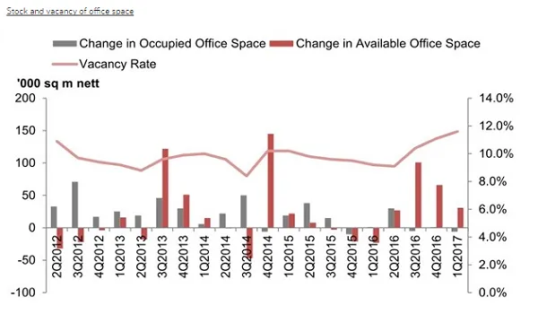 Meanwhile, the stock of office space increased by 31,000 sqm in 1Q17, in contrast to the increase of 66,000 sqm during the previous period.