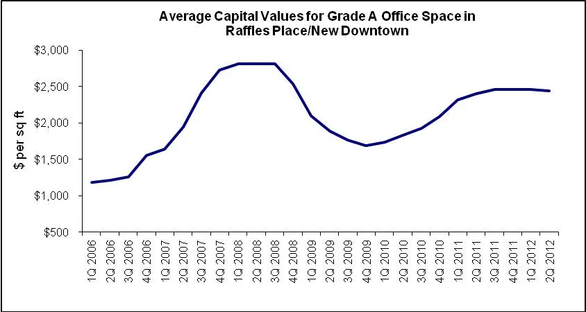 The average capital values of Grade A office space in the Raffles Place/New Downtown micro-market softened by a marginal 0.5 per cent – from the S$2,459 per sq ft recorded in 1Q 2012 to S$2,447 per sq ft by end June 2012.