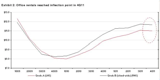 “Over 2H11, we saw office rents peak as Grade A rents declined 0.5% QoQ in 4Q11 while Grade B rents fell by 0.4%,” it said.