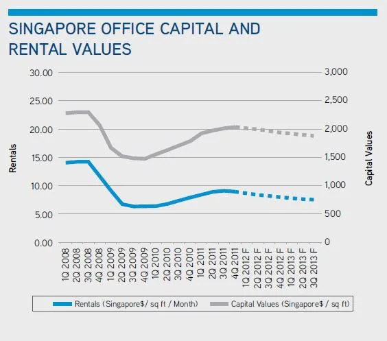 “Hence, though Singapore’s office rents will likely soften from current levels, the magnitude of decline is expected to be more tamed as compared to the previous crisis. Office rents are forecast to decline by around 10-15% in 2012 as against a 20-50% correction seen in the first year of the global financial crisis-led decline in 2009,” Colliers said in a report.