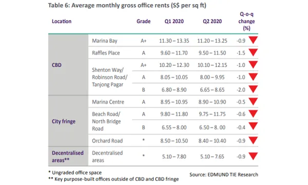 Grade B offices at Shenton Way/Robinson Road/Tanjong Pagar led the decline.