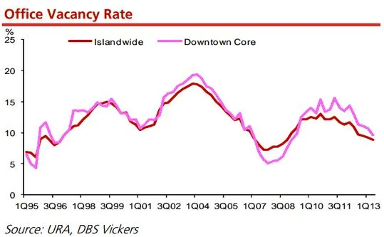 Against this backdrop, island-wide vacancy dipped to 8.8% from 9.4% as at end Dec 2012. The entire Robinsons Tower and Annexe Building, IFS Building, Corporate Office, Cecil House and some floors of DBS Tower 1 have been vacated for redevelopment.